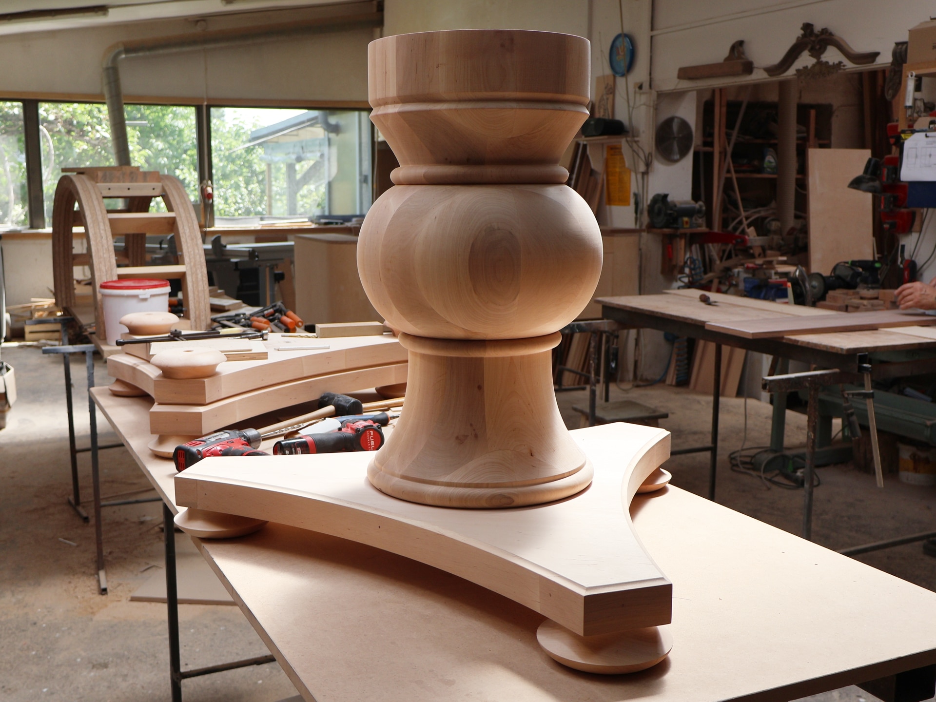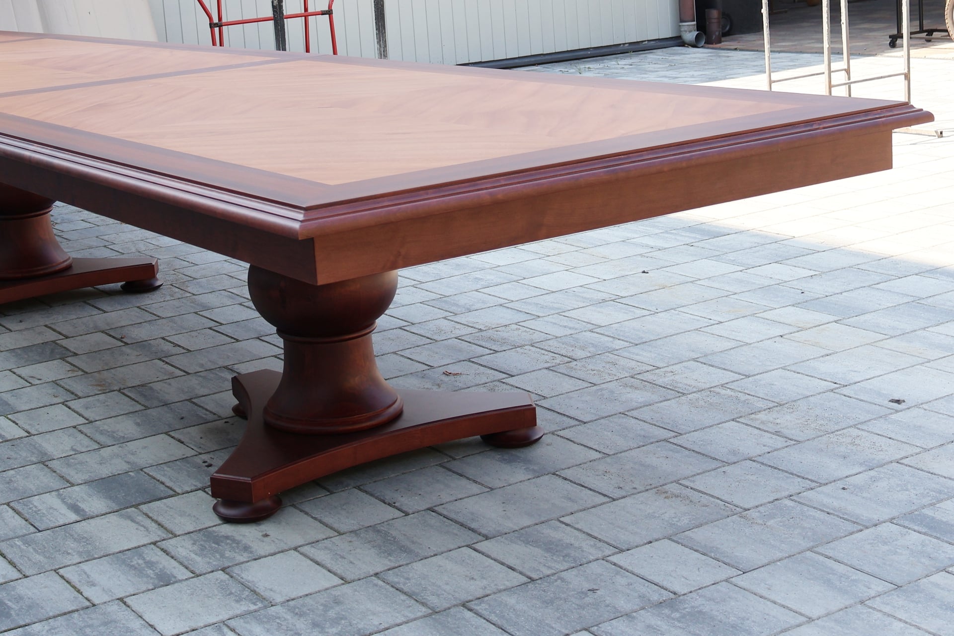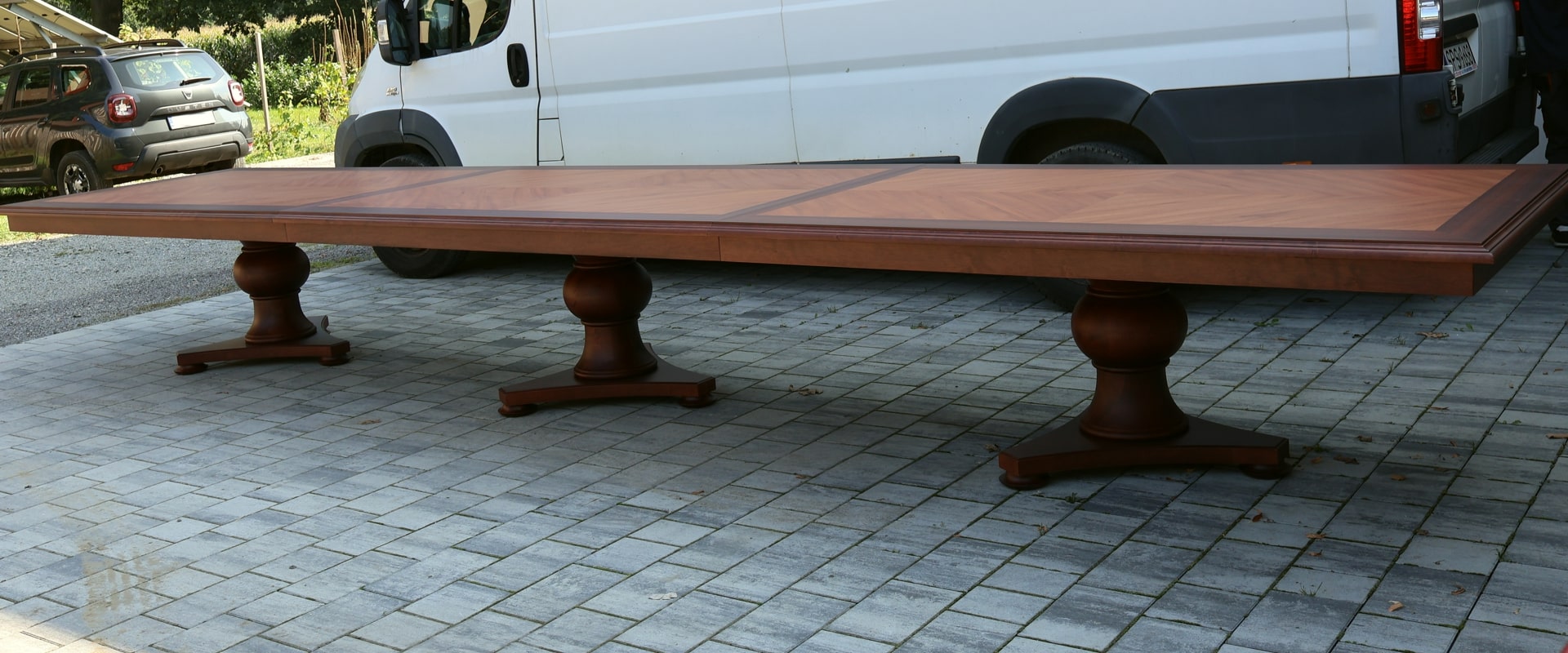 Stół konferencyjny wykonany w stylu klasycznym na trzech dużych toczonych nogach. Wymiary całkowite stołu: 600cmx120cmx76cm. Na blacie położony jest fornir mahoniowy i układany orzech. Nogi wykonane są z litego drzewa olchowego.